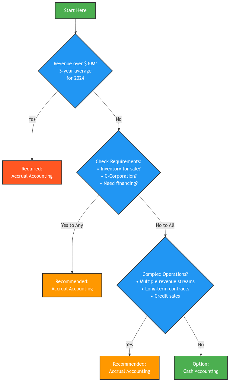 While not always legally required, accrual accounting is often mandated for larger businesses (over $30 million in average annual gross receipts for 2024) or those that sell stock. Additionally, GAAP generally requires accrual accounting.