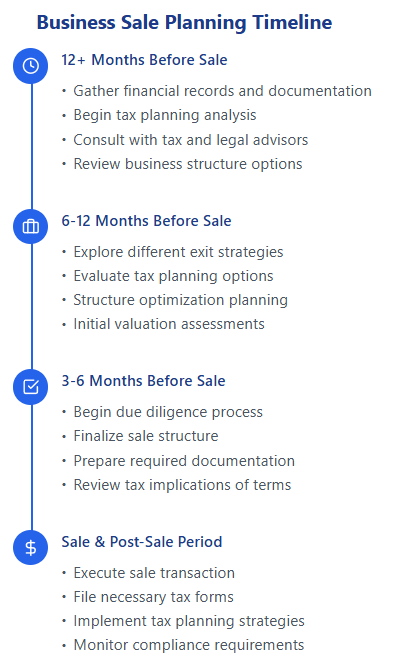 - 12+ months before the sale: Start gathering financial records and consulting with tax and legal advisors.