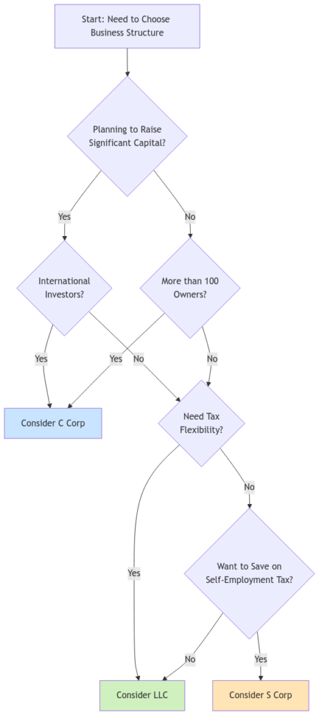 Use this flowchart as a quick guide to determine which business structure might be most appropriate for your situation. While this provides a good starting point, remember to consider all factors and consult with professionals before making your final decision.
