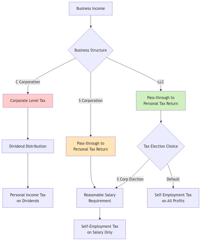 This flowchart illustrates how income flows through different business structures and its tax implications. Understanding these paths is crucial for making an informed decision about your business structure and planning for tax efficiency.
