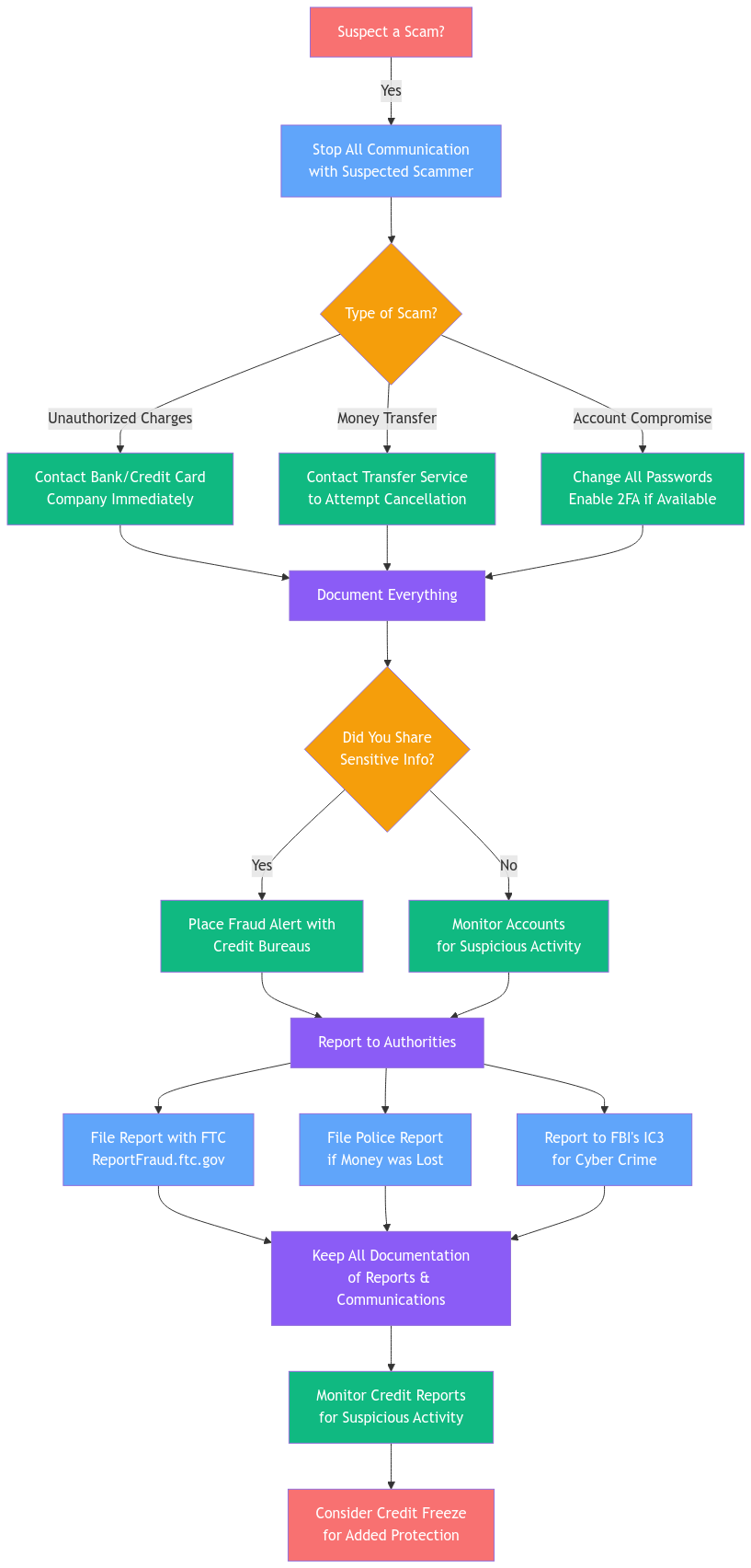 A flowchart illustrating the steps to take if you suspect you’ve been a victim of a scam.