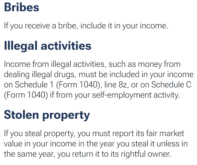 • The IRS requires taxpayers to report all income, regardless of its source, including income from illegal activities. (IRS Publication 17)