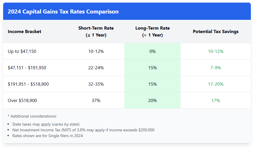 - Short-term capital gains: Apply to assets held for one year or less. These are taxed at your ordinary income tax rate.