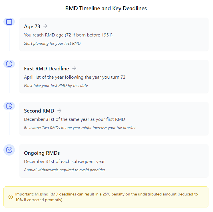 Missing the first RMD deadline: Remember that your first RMD has a different deadline (April 1st of the year after you turn 73 or 72, depending on your birth year) than subsequent RMDs (December 31st of each year).