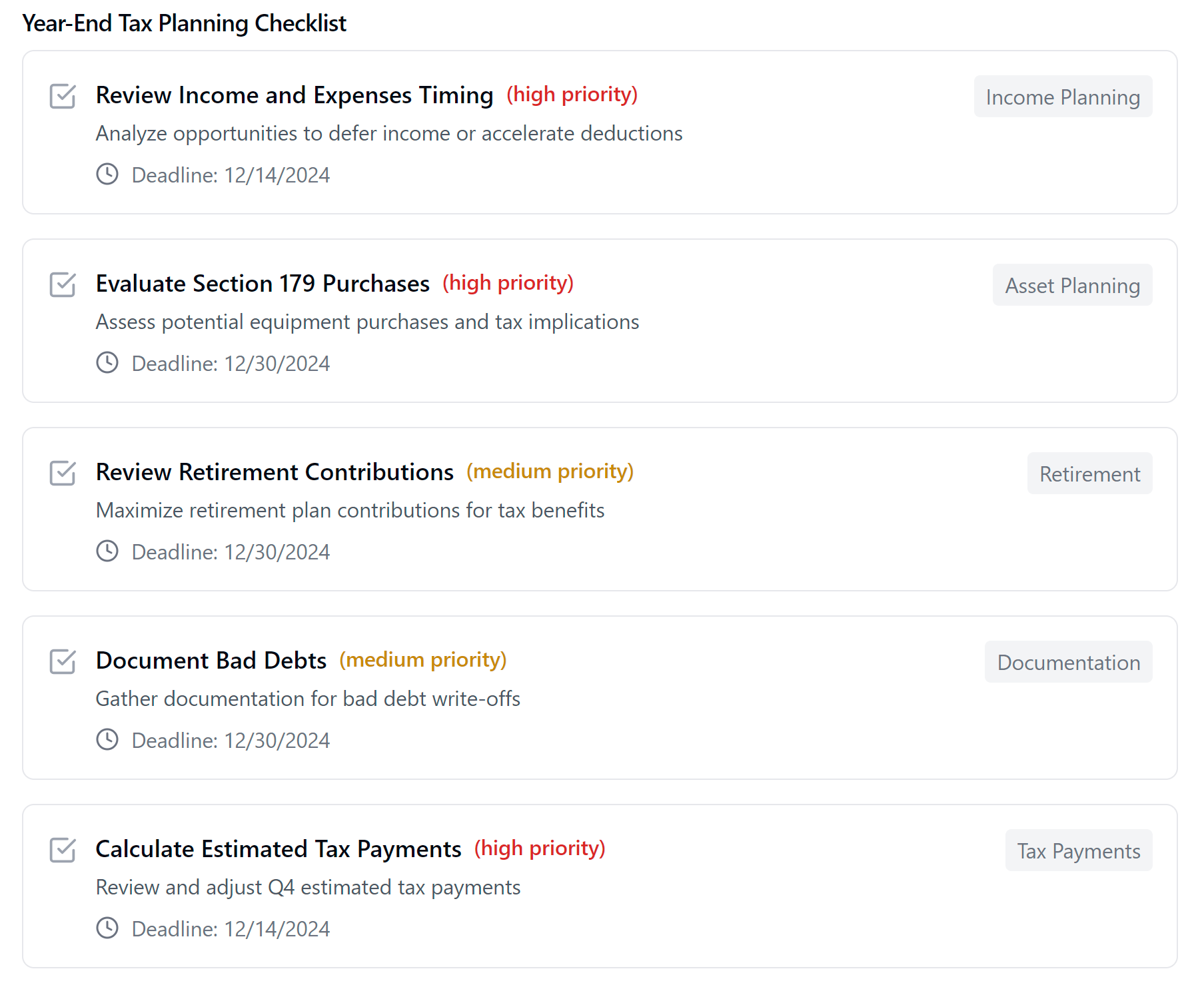 To help you stay on track with your year-end tax planning, here’s an interactive checklist of key tasks to complete: